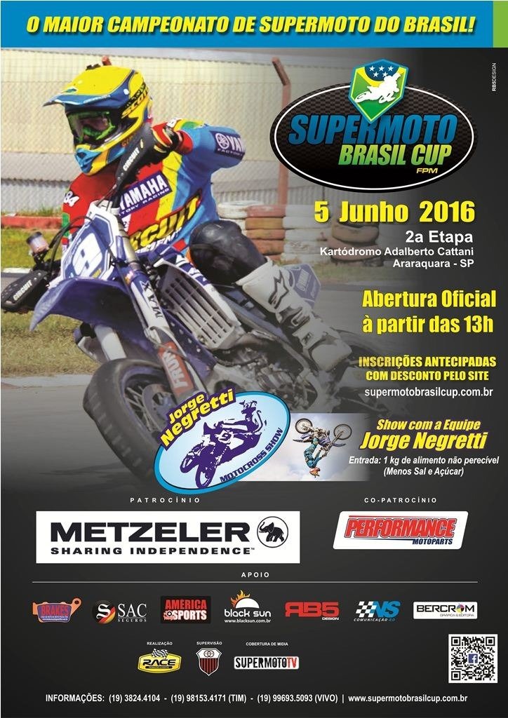 A Race Promoções e Eventos informa que estão abertas as inscrições para a segunda etapa do Supermoto Brasil Cup FPM 2016, que será realizada no dia 5 de Junho no Kartódromo Adalberto Nenê Cattani, em Araraquara (SP). O prazo para inscrição antecipada com desconto se encerra no dia 1 de Junho, última quarta-feira antes do evento.