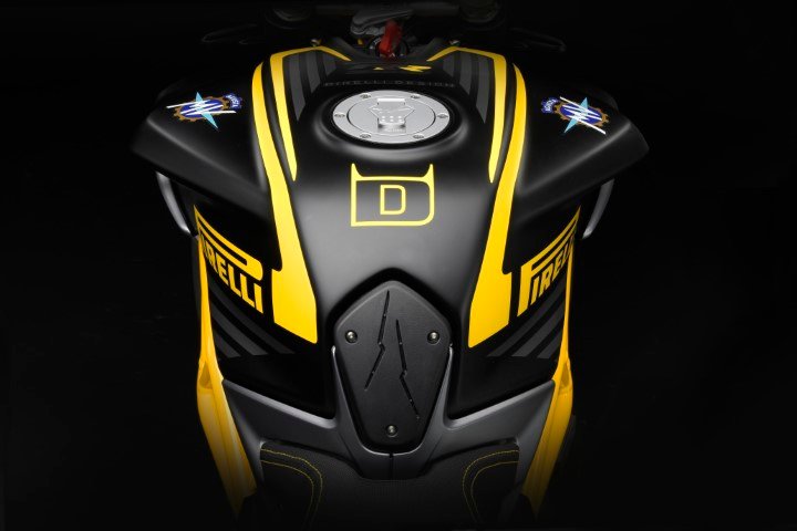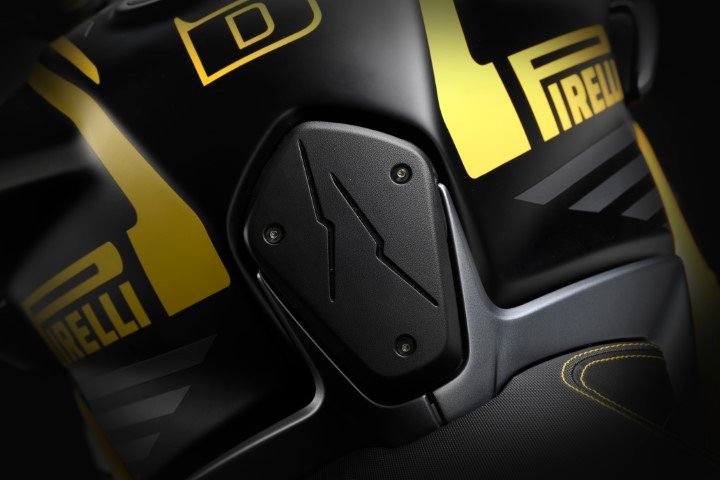 Na verdade, o controle deslizante do tanque e a carenagem são feitos de borracha especialmente formulados pelo departamento de Pesquisa e Desenvolvimento da Pirelli para garantir resistência superior a riscos e fricção a que esses itens estão sujeitos, bem como a agentes atmosféricos e químicos, como o combustível. Ambos os elementos de borracha são reconhecíveis graças ao icónico símbolo “flash” que distingue os pneus da linha DIABLO ™, incluindo o DIABLO ™ Supercorsa SP que equipa este modelo – na frente 120/70 ZR17 e na traseira 200/55 ZR17 com uma roda de seis polegadas.