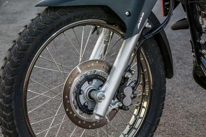 Um detalhe que trouxe um ar diferenciado ao modelo está nas rodas raiadas com acabamento em cromo fumê, mais sofisticado neste tipo de acabamento e categoria. Nelas estão calçadas ainda pneus para uso de tipo misto na configuração 90/90 – 19M/C 52P (dianteiro) e 110/90 – 17M/C 60P (traseiro).